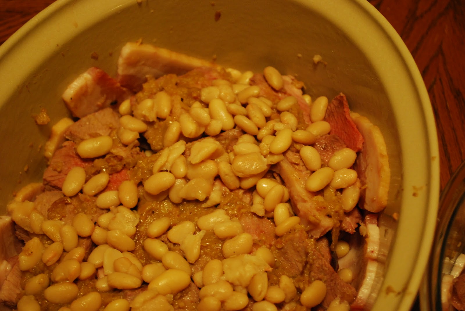 I made a few changes from the Bourdain/Rhulman recipe, which some would call sacreligious since this has been toted as “the best cassoulet recipe outside of France”. But hey, I was making it, and that is what cooking is all about, to breath a little bit of you into everything you make. Firstly, I used chicken and not duck. Apparently Kansas City is quite bare of duck. Secondly, I used a combination of bacon grease and clarified butter during my confiting. I searched high and low for duck fat, in all kinds of crazy places around the city, only to learn two weeks later that you could buy a jar at Williams-Sonoma. Thirdly, I threw out the pork rind and belly from the recipe (because, ew, pork belly?) and instead used a deliciously marbeled boston butt pork roast and some extra thick cut, hormone free, free-range, smoked, drool-worthy bacon. I couldn’t find any traditional “french” sausages here, so I opted for some locally made apple chicken sausages. And lastly, I’m a big “bite sized” person. I prefer chicken stips to chicken breasts. Also, I didn’t like the idea of fighting over the chicken legs, the sausages, and that giant roast at the bottom. So I sliced, pulled, and made everything into perfect sized pieces. I think this gave it more of a “stew” appearance, and I liked it.