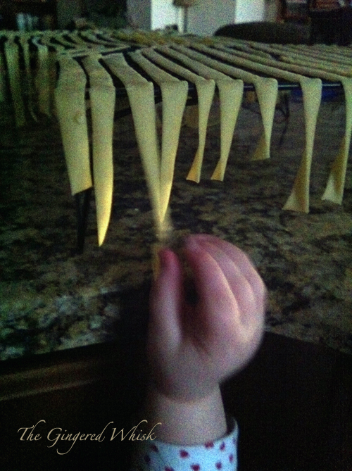 - Carefully pick up the pasta strands and hang them up to dry. You can hang them over a wooden spoon suspended between two glasses, or a clean broom handle suspended over two chairs, or you can even place them on a cooling rack. They just need to be separated and have some air flow to dry and not stick together.